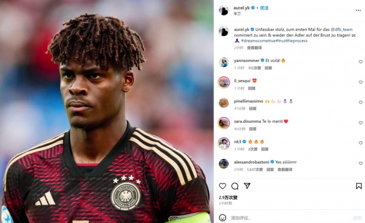 他也在社媒曬出自己在德國國青時期的照片,并配文:“我非常自豪能夠首次入選德國隊,并且再次捍衛(wèi)胸前的隊徽。????????#夢想成真#相信努力必有回報#”。