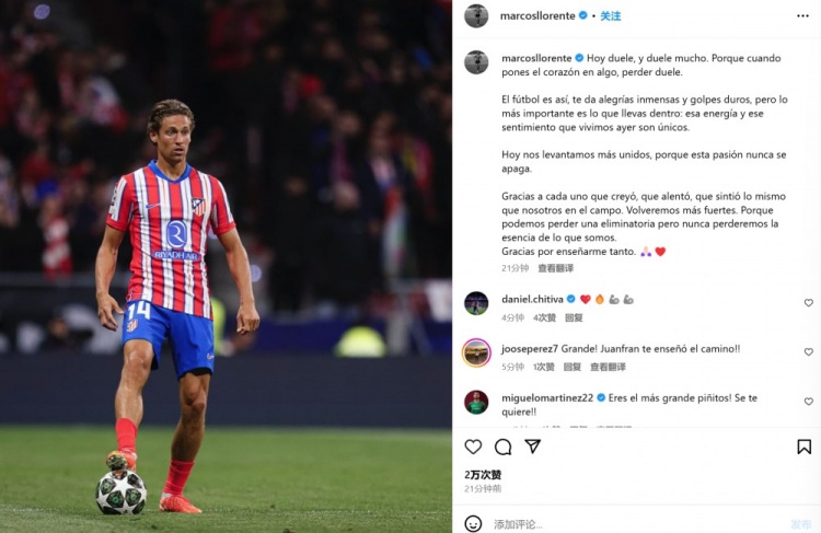 3月14日訊 馬競(jìng)在本輪歐冠主場(chǎng)被皇馬點(diǎn)球淘汰,出自皇馬青訓(xùn)的馬科斯-略倫特罰丟點(diǎn)球,他也在今日通過(guò)社媒發(fā)文。
