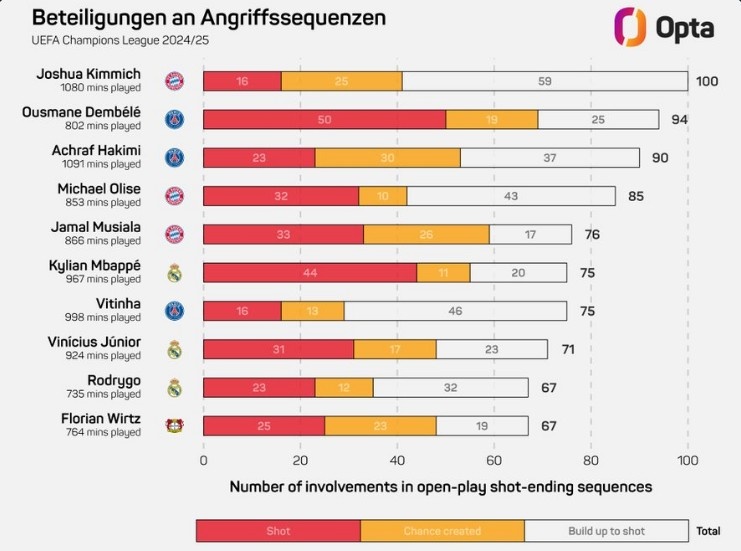 3月14日訊 拜仁官方宣布基米希與球隊續(xù)約,數(shù)據(jù)網(wǎng)站OPTA統(tǒng)計,基米希是本賽季歐冠運動戰(zhàn)參與形成射門進攻次數(shù)最多的球員,具體榜單如下(射門+創(chuàng)造機會+組織形成射門的進攻):