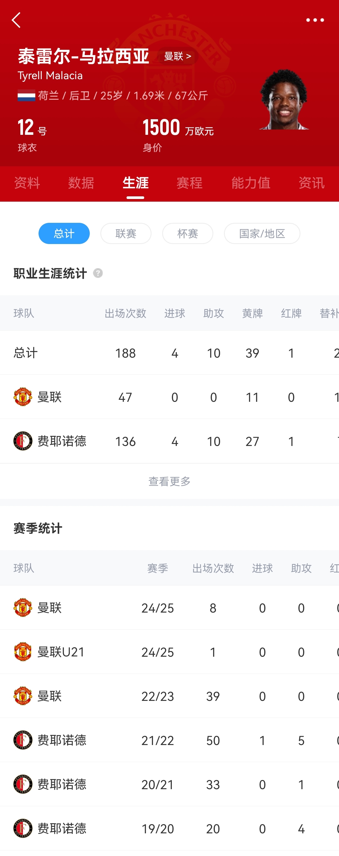 馬拉西亞是滕哈赫執(zhí)教期間1500萬歐元從費(fèi)耶諾德簽下的,但加盟以后受傷病和適應(yīng)問題的困擾,2年半總共只為曼聯(lián)出場47次。
