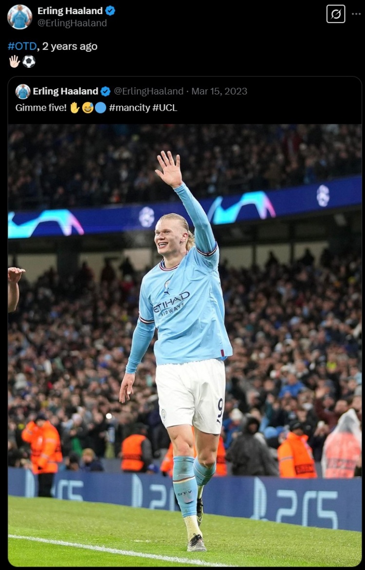 3月14日訊 在2023年的今天,哈蘭德在歐冠1/8決賽次回合曼城7-0大勝萊比錫的比賽中上演五子登科。哈蘭德在個人社媒也轉(zhuǎn)發(fā)了自己當年的動態(tài),配文寫道:“2年之前??????????” 標簽: 足球 英超 曼城