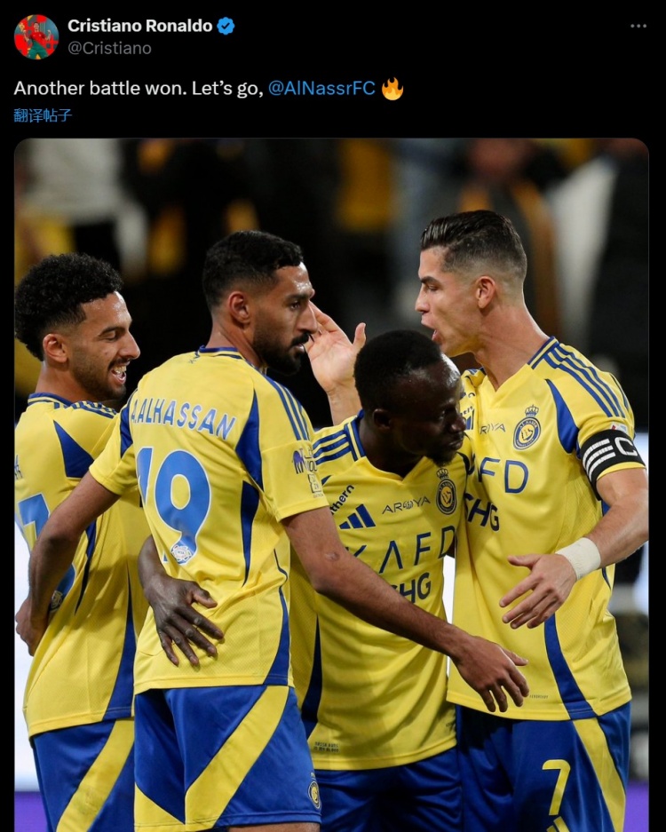 數(shù)據(jù)統(tǒng)計顯示這也是C羅生涯第928球,他也在賽后通過社媒曬出和隊友的慶祝照并配文:“又贏下一場戰(zhàn)斗,讓我們繼續(xù)前進!@利雅得勝利俱樂部”。