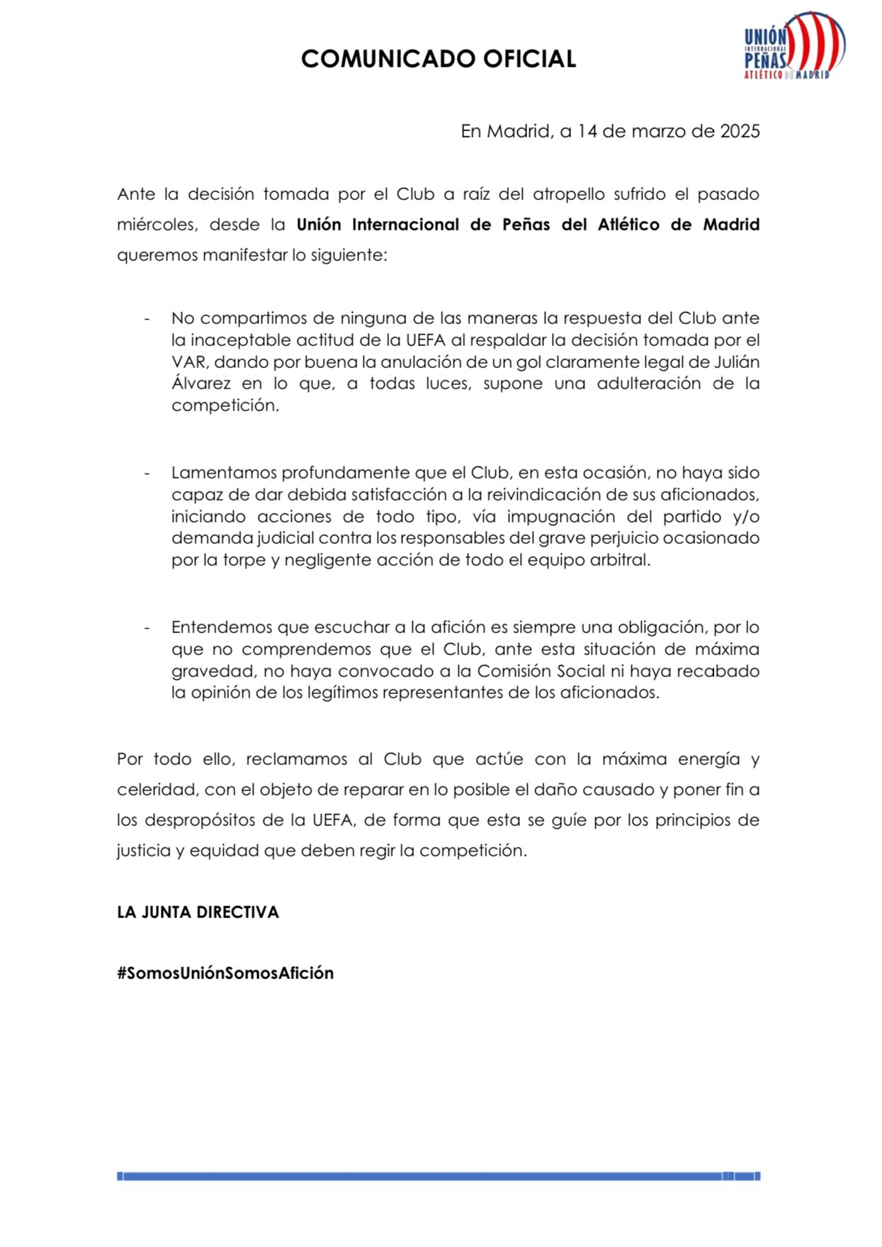 馬競(jìng)球迷協(xié)會(huì)發(fā)表聲明,希望俱樂部對(duì)阿爾瓦雷斯點(diǎn)球被取消一事采取措施。