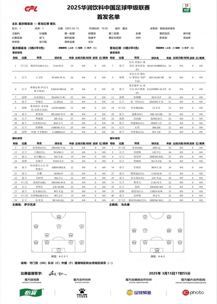 3月15日訊 中甲首輪比賽,重慶銅梁龍主場迎戰(zhàn)青島紅獅,目前雙方首發(fā)名單已經(jīng)公布。