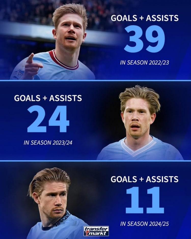 3月16日訊 曼城在本輪英超2-2戰(zhàn)平布萊頓,德布勞內(nèi)最后時(shí)刻替補(bǔ)登場(chǎng),《轉(zhuǎn)會(huì)市場(chǎng)》統(tǒng)計(jì)顯示他的關(guān)鍵數(shù)據(jù)近年持續(xù)下滑: