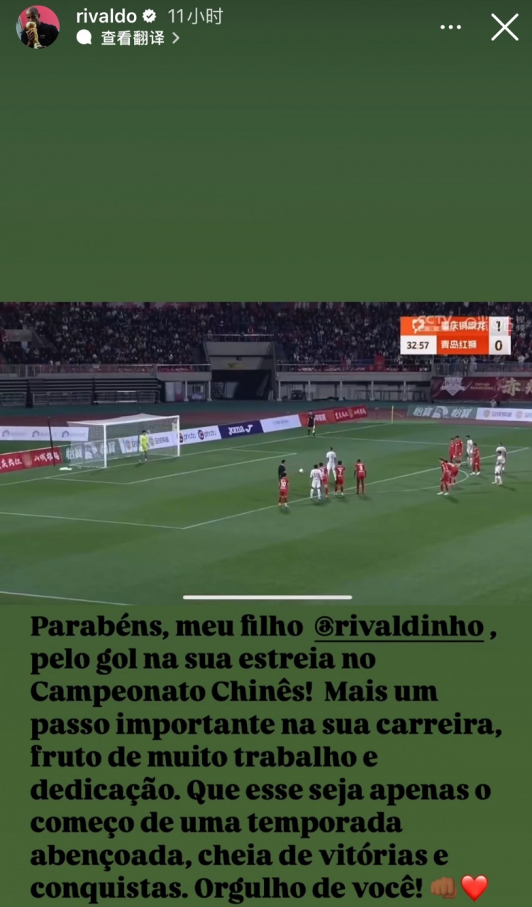 賽后,里瓦爾多在社媒曬出了兒子的進(jìn)球視頻并配文祝賀寫(xiě)道: