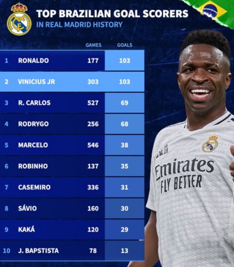 3月16日訊 《轉(zhuǎn)會市場》統(tǒng)計(jì)了皇馬歷史巴西球員進(jìn)球榜,大羅和維尼修斯均打進(jìn)103球并列最多。