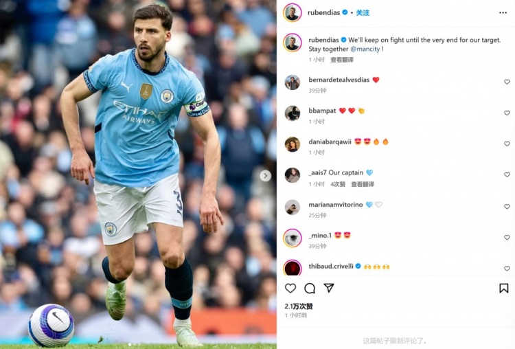 魯本-迪亞斯曬出自己的比賽照,并配文:“我們將會(huì)繼續(xù)為了目標(biāo)而戰(zhàn)斗到最后一刻。團(tuán)結(jié)起來(lái)@曼城俱樂(lè)部!”