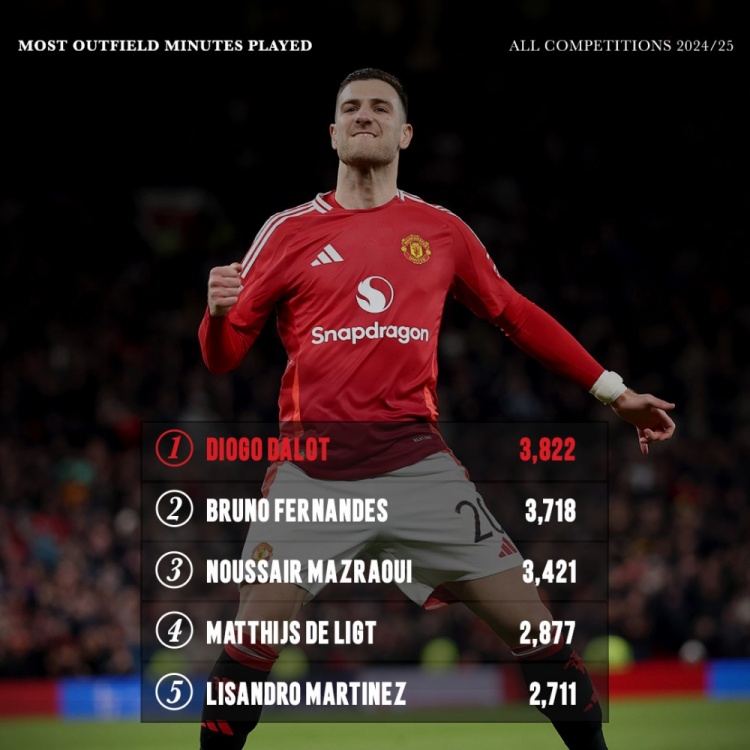 3月16日訊 曼聯(lián)官方統(tǒng)計(jì)了本賽季各項(xiàng)賽事非門將球員的出場時間,達(dá)洛特壓B費(fèi)居首。