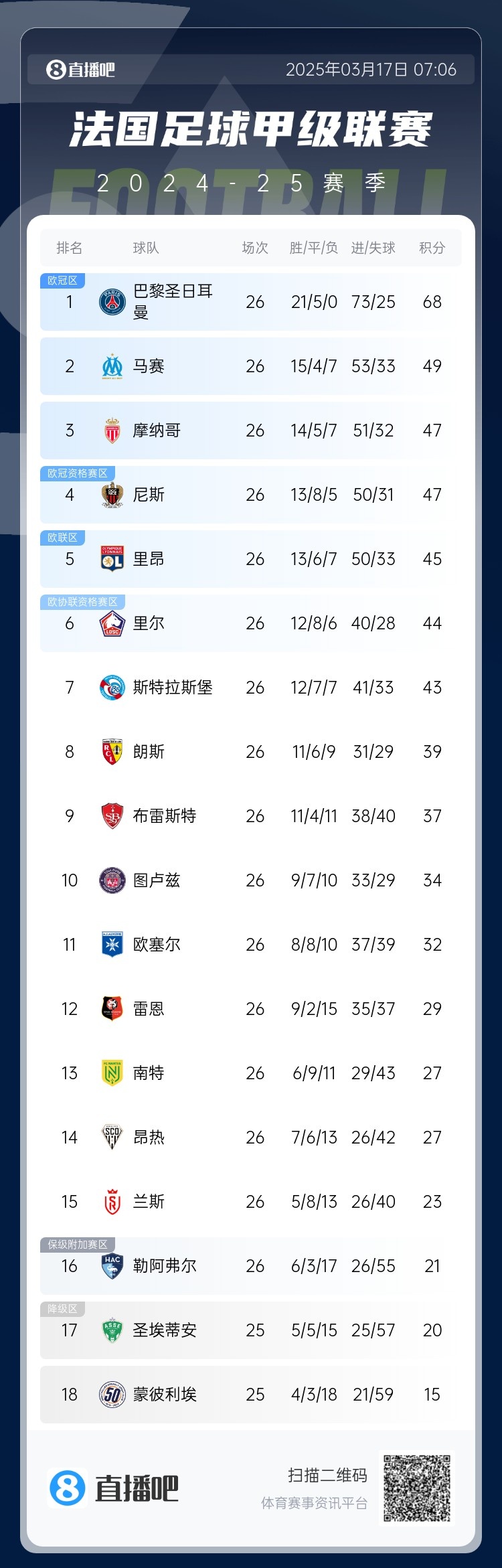 在法甲26輪過后巴黎領(lǐng)先次席馬賽的優(yōu)勢已經(jīng)達(dá)到19分,在聯(lián)賽還剩8輪的情況下,如果下一輪比賽巴黎獲勝,而馬賽輸球,摩納哥與尼斯戰(zhàn)平的話,巴黎即可提前奪得冠軍。