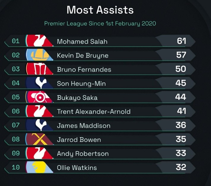 3月17日訊 在本輪英超曼聯(lián)3-0大勝萊斯特城的比賽中,B費助攻雙響,個人英超助攻數(shù)達到50次。以下為自B費2020年2月英超首秀以來英超同期助攻榜: