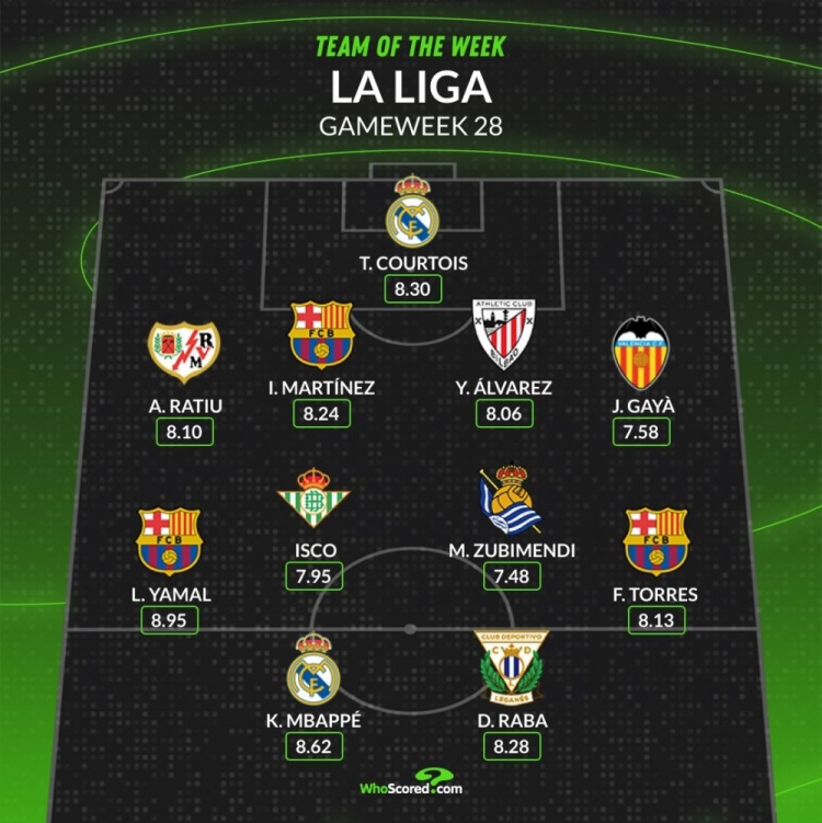 中場(chǎng):亞馬爾(巴薩,8.95分)、伊斯科(貝蒂斯,7.95分)、祖比門迪(皇社,7.48分)、費(fèi)蘭(巴薩,8.13分)