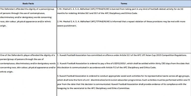 3月17日訊 2024年10月25日U17亞洲杯預(yù)選賽科威特對(duì)陣澳大利亞的比賽中,科威特球員米沙勒因種族歧視行為被亞足聯(lián)處罰。