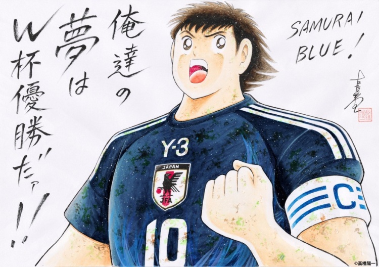 日本隊官推曬出了一張由《足球小將》作者高橋陽一手繪的大空翼海報,文字內容為:“藍武士!我們的夢想是世界杯冠軍!”