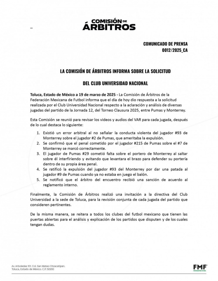 墨西哥美洲獅俱樂部賽后提出申請,希望墨西哥裁判委員會(huì)對比賽中的判罰做出澄清和分析,裁判委員會(huì)發(fā)布公告,確認(rèn)當(dāng)值主裁存在失誤,拉莫斯上半場肘擊對手就應(yīng)該被罰下,但裁判沒有對其出示紅牌。
