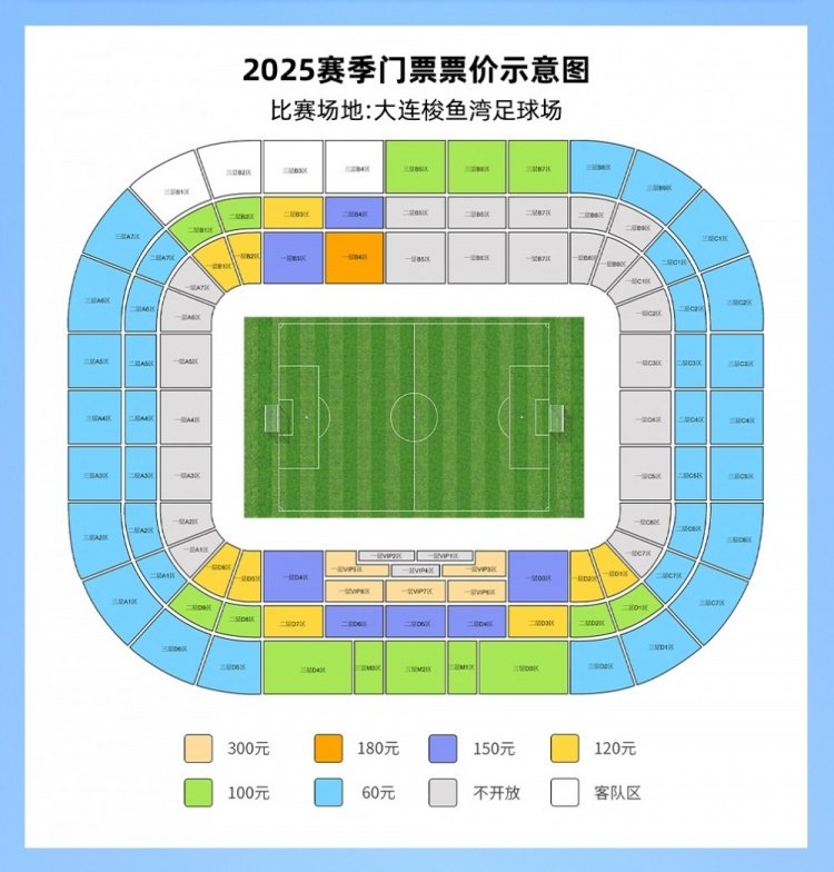 本賽季,大連英博的主場仍是梭魚灣足球場。俱樂部將主場看臺散票劃分為6個(gè)區(qū)域,每個(gè)區(qū)域票價(jià)不同,分別為60元、100元、120元、150元、180元和300元。
