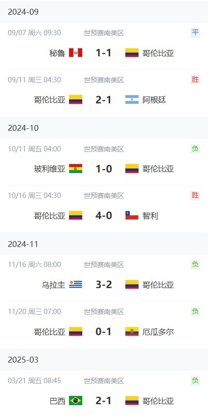 哥倫比亞在世預(yù)賽已經(jīng)遭遇3連敗,而在其美洲杯決賽不敵阿根廷之后,球隊在近7場比賽只取得2勝1平4負。具體戰(zhàn)績?nèi)缦拢?/p>