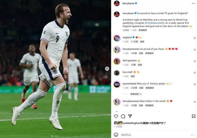 本場比賽凱恩破門,小將斯凱利也取得國家隊(duì)處子球,凱恩賽后曬出慶祝進(jìn)球照片,配文寫道:“為打進(jìn)國家隊(duì)第70球感到無比自豪。在溫布利球場的美妙之夜,也為世界波預(yù)選賽開了一個好頭。祝賀斯凱利度過一個特殊的首秀并且取得進(jìn)球,也祝賀丹-伯恩完成球隊(duì)首秀!”