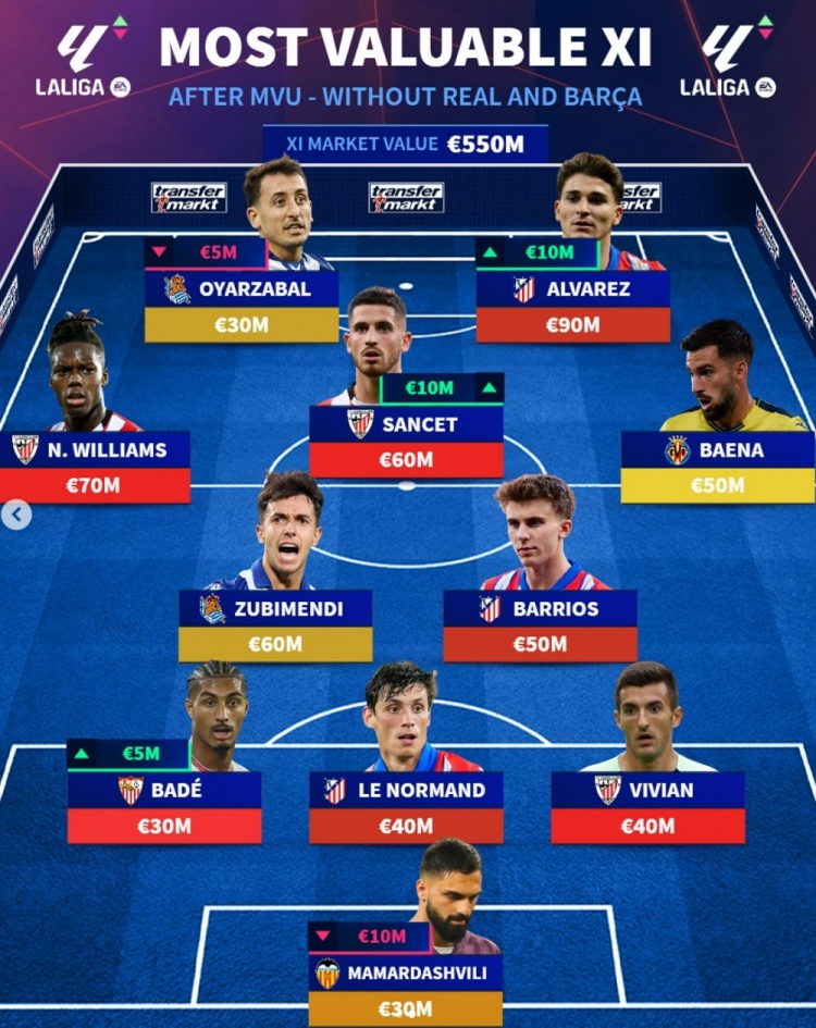 3月22日訊 德轉(zhuǎn)更新了西甲球員身價,并盤點了除皇馬、巴薩球員之外的西甲最貴陣容,其中阿爾瓦雷斯領(lǐng)銜馬競3人在列,具體如下: