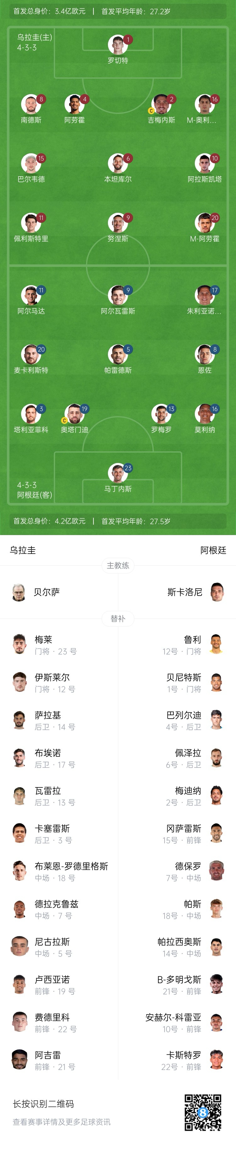 烏拉圭首發(fā):1-羅切特、8-南德斯、4-阿勞霍、2-吉梅內(nèi)斯、16-奧利維拉、15-巴爾韋德、6-本坦庫爾、10-阿拉斯凱塔、11-佩利斯特里、20-M-阿勞霍、9-努涅斯