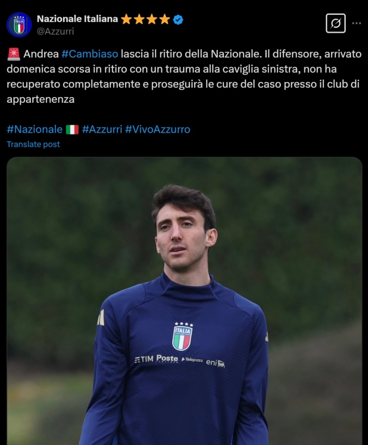 在對陣佛羅倫薩的比賽中,坎比亞索左腳踝受傷。隨后,他帶傷入選了意大利國家隊(duì),但沒有參加合練和對陣德國的首回合比賽。