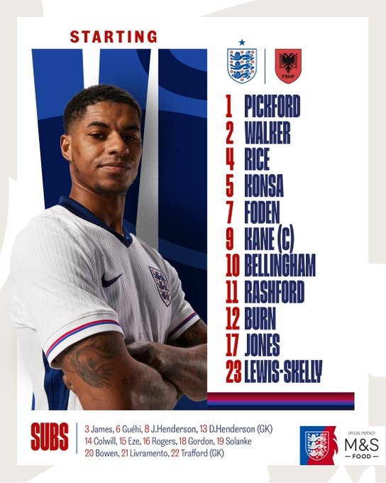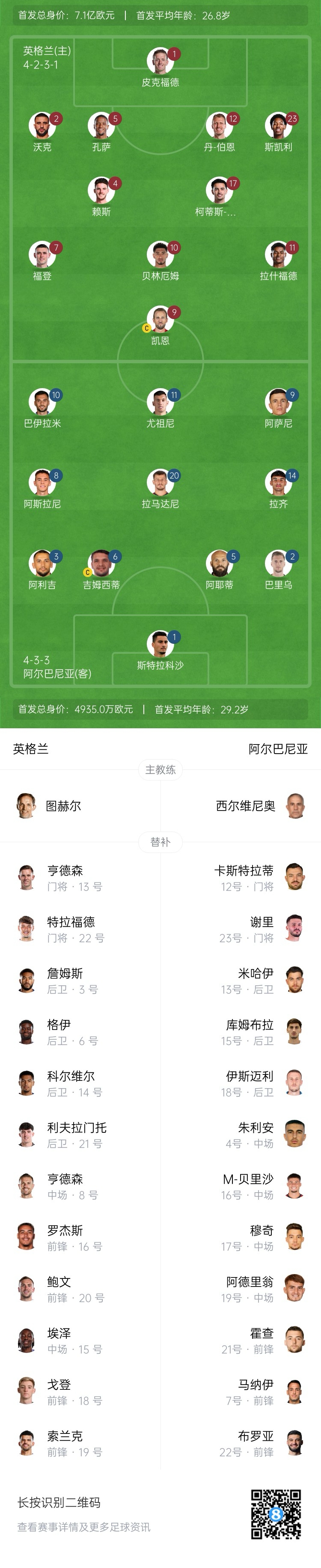 英格蘭首發(fā):1-皮克福德、2-沃克、5-孔薩、12-丹-伯恩、23-斯凱利、4-賴(lài)斯、17-柯蒂斯-瓊斯、7-福登、10-貝林厄姆、11-拉什福德、9-凱恩
