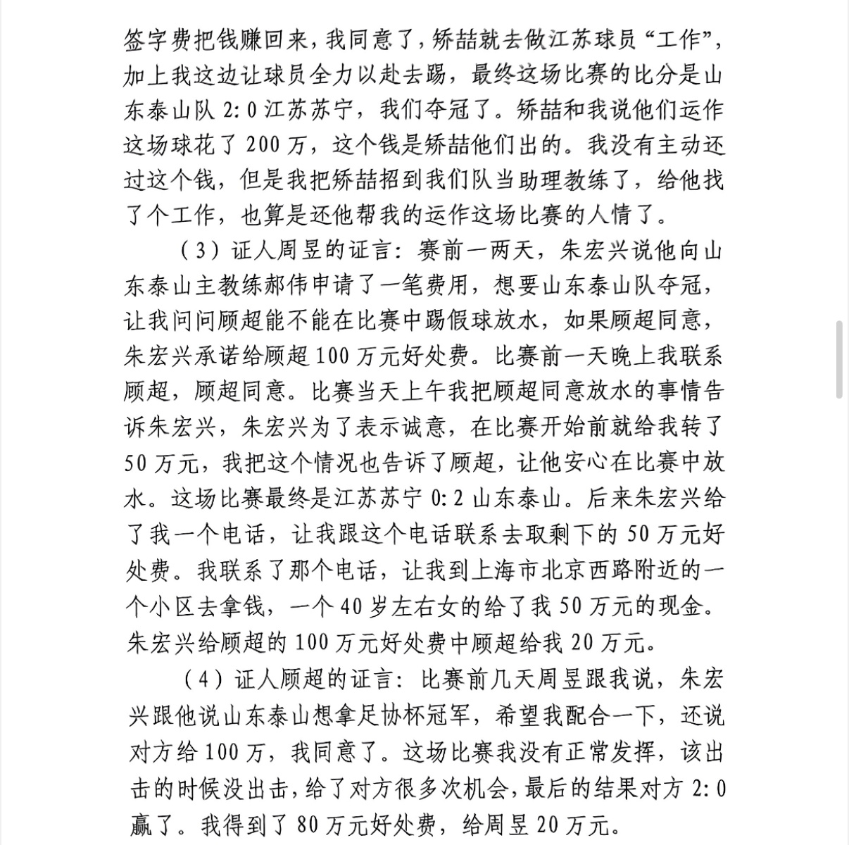 矯喆的證言:朱宏興讓我去問郝偉,他能幫著找江蘇蘇寧隊的顧超來踢假球,幫助山東泰山隊奪冠,但得讓郝偉拿點費用。我就聯(lián)系郝偉,郝偉說沒有這個費用,弄不了。我把這個情況跟朱宏興說了后,朱宏興說他可以先墊付費用,然后郝偉那邊球員轉(zhuǎn)會、簽字費等方式來解決費用。我跟郝偉說了朱宏興的這種想法后,郝偉也認可了,讓我們?nèi)ヅ?。之后朱宏興我倆商量的是向郝偉要260萬的費用,給顧超170萬好處費,剩下的費用我倆平分。我就又跟郝偉說了給顧超260萬好處費的事,郝偉也同意了。我這邊跟郝偉說好費用后,朱宏興就聯(lián)系了顧超,顧超也同意了踢假球幫山東泰山隊贏球奪冠。最后比賽結(jié)果是山東泰山2:0江蘇蘇寧,郝偉260萬的費用這筆錢到現(xiàn)在還沒給。