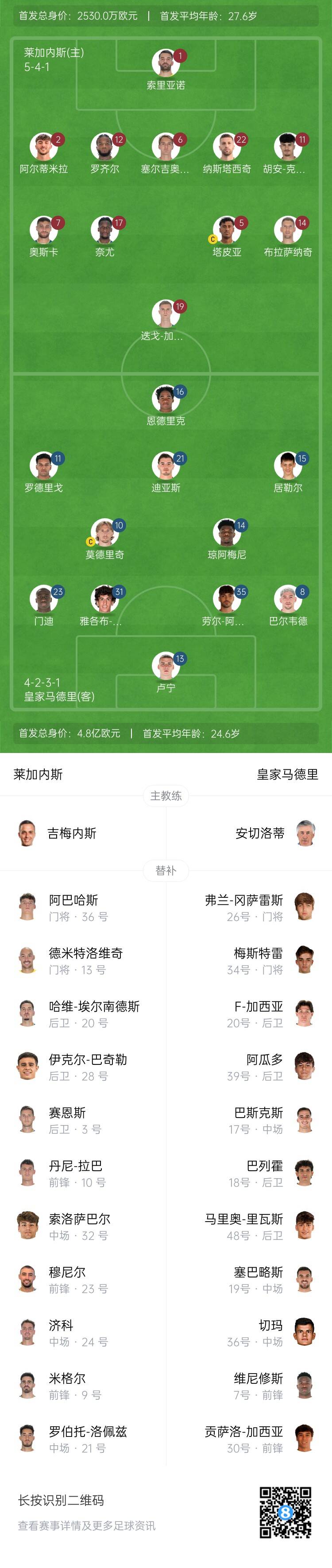 2月6日訊 國王杯1/4決賽,皇馬對陣萊加內斯。賽前,官方公布了本場的首發(fā)名單,姆巴佩、貝林厄姆缺陣。
