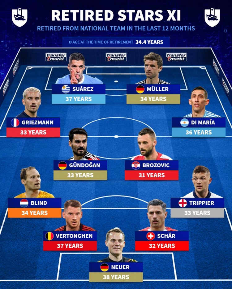 3月23日訊 德國轉(zhuǎn)會市場列出了近一年從國家隊(duì)退役的球星陣容,蘇亞雷斯、穆勒、格列茲曼、迪馬利亞、諾伊爾在列。