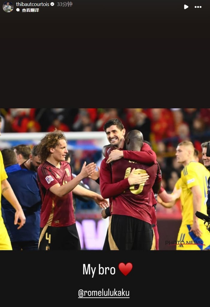 3月24日訊 今天凌晨,比利時(shí)在歐國聯(lián)3-0戰(zhàn)勝烏克蘭,庫爾圖瓦賽后曬出自己與盧卡庫擁抱的照片。