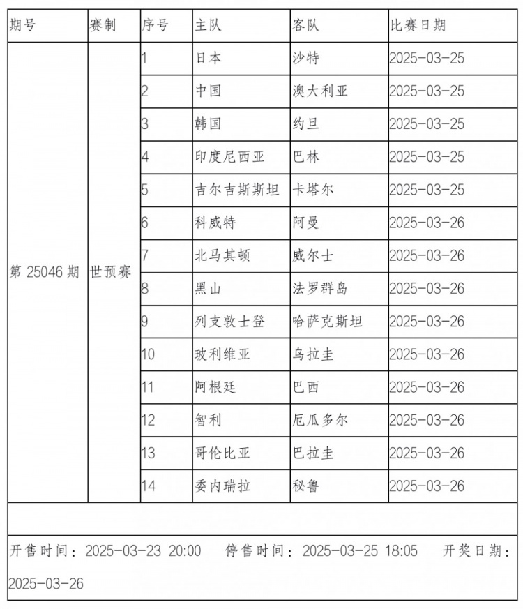 傳足勝負彩第25046期競猜賽事為亞洲區(qū)、歐洲區(qū)和南美區(qū)的世界杯預選賽。本期,亞洲區(qū)中國、日本和韓國東亞三強將分別在主場對陣澳大利亞、沙特和約旦,南美區(qū)則迎來阿根廷VS巴西的重頭戲。