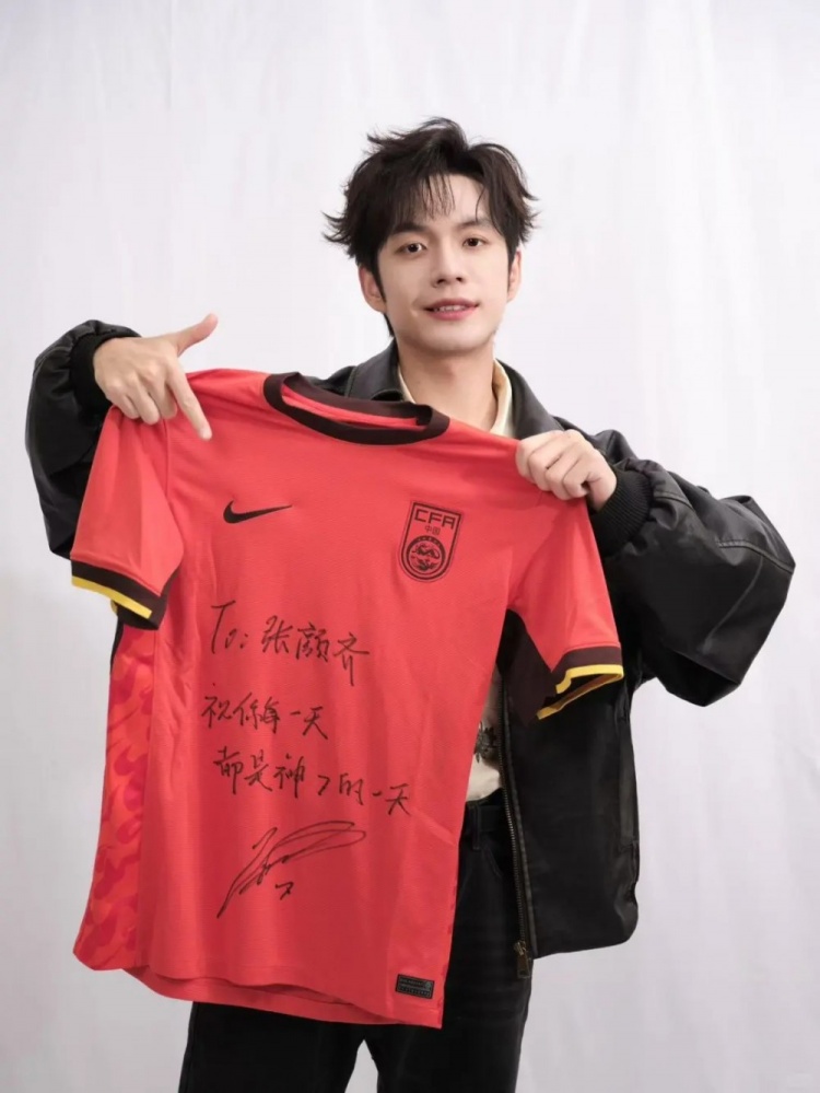 3月24日訊 在個(gè)人社媒,歌手張顏齊曬出武磊to簽的國(guó)足球衣。