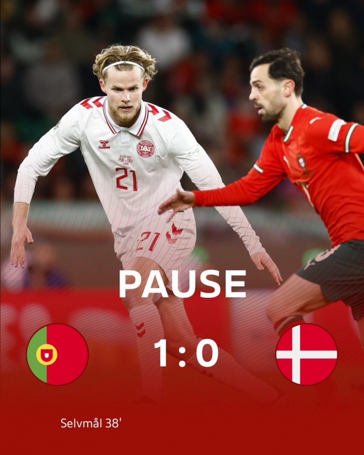 3月24日訊 北京時間3月24日03:45,歐國聯(lián)八強(qiáng)戰(zhàn)次回合葡萄牙迎戰(zhàn)丹麥的比賽在阿爾瓦拉德球場進(jìn)行,上半場C羅開場造點(diǎn)+點(diǎn)射被撲,達(dá)洛特頭球造險,B費(fèi)角球造安德森解圍自擺烏龍,半場結(jié)束,葡萄牙1-0丹麥。