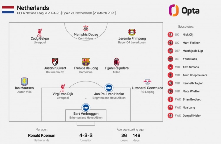 3月24日訊 歐國(guó)聯(lián)1/4決賽次回合,荷蘭前往客場(chǎng)挑戰(zhàn)西班牙。本場(chǎng)比賽,荷蘭主帥科曼排出了一套沒有任何荷甲球員的首發(fā)陣容,2017年11月9日以來首次出現(xiàn)如此局面。