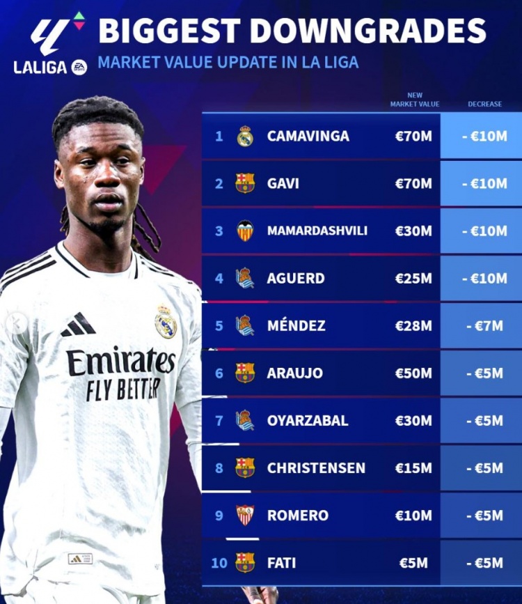 德轉(zhuǎn)列西甲身價貶值榜:歐元