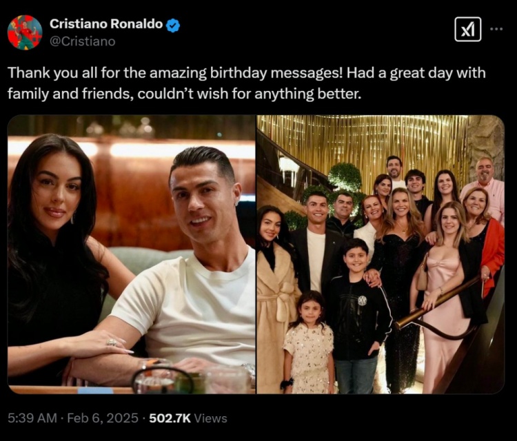 C羅寫(xiě)道:感謝大家送上的精彩生日祝福!我和親朋好友一起度過(guò)了美好的一天,沒(méi)有什么比這更好的了。