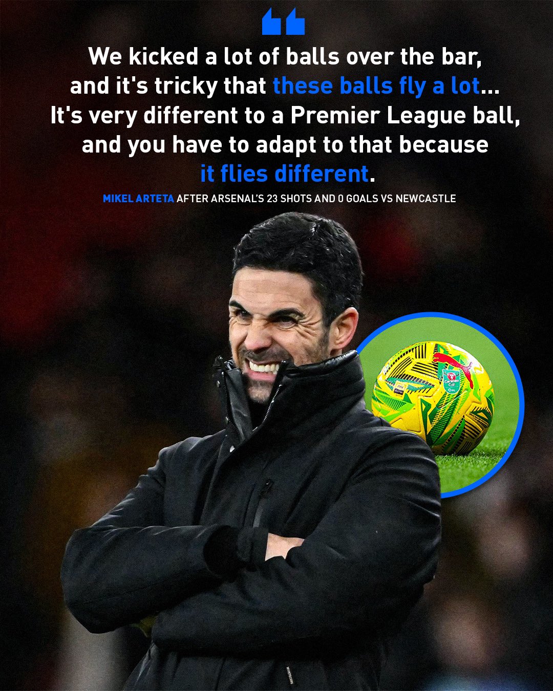在首回合阿森納主場0-2不敵紐卡的賽后,阿爾特塔談到了比賽用球,表示聯(lián)賽杯用球與英超用球非常不同,必須要適應。”