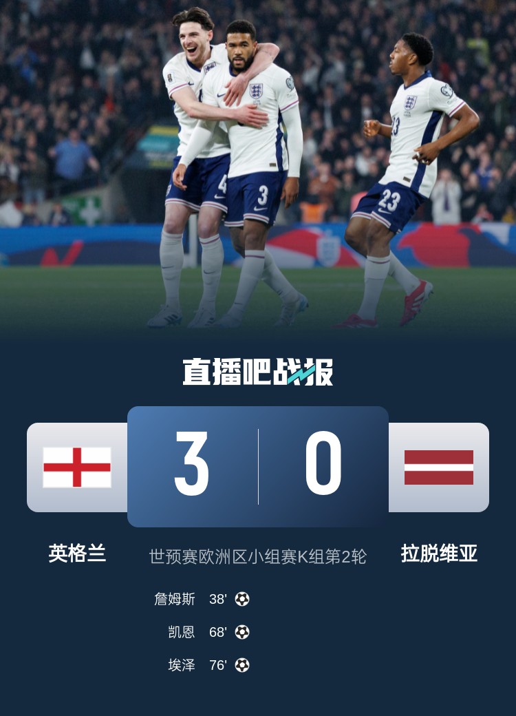 里斯-詹姆斯精彩任意球破門(mén),賴(lài)斯助攻凱恩破門(mén),埃澤單兵爆破建功。最終,英格蘭3-0戰(zhàn)勝拉脫維亞,世預(yù)賽2連勝暫3分領(lǐng)跑K組。