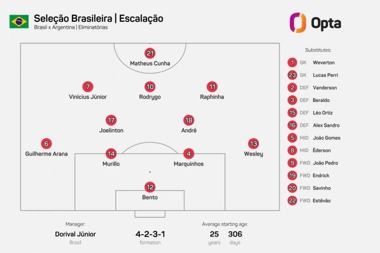 巴西公布了此役的首發(fā)陣容,Opta指出,巴西隊(duì)先發(fā)陣容中超過一半的球員在國家隊(duì)的首發(fā)次數(shù)不超過5次,分別是安德烈(5)、庫尼亞(3)、本托(2)、喬林頓(2)、穆里略(0)、韋斯利(0)。