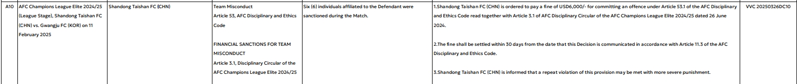 1.山東泰山對(duì)陣光州FC時(shí)有6人染黃,因違反亞足聯(lián)紀(jì)律與道德準(zhǔn)則第53.1條以及亞足聯(lián)亞冠精英聯(lián)賽紀(jì)律通告第3.1條,被罰款6000美元。