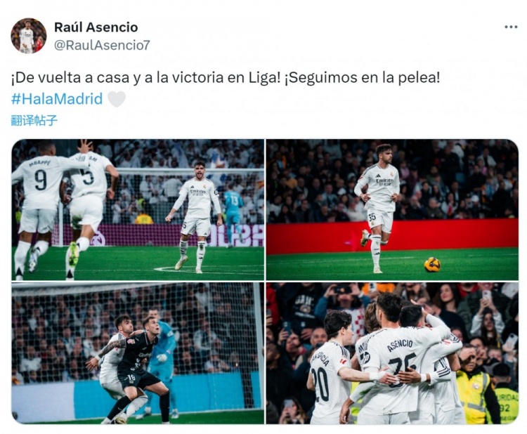 勞爾-阿森西奧社媒曬出比賽照片,并配文:“回到主場,在聯(lián)賽中取得勝利!我們仍在戰(zhàn)斗!”