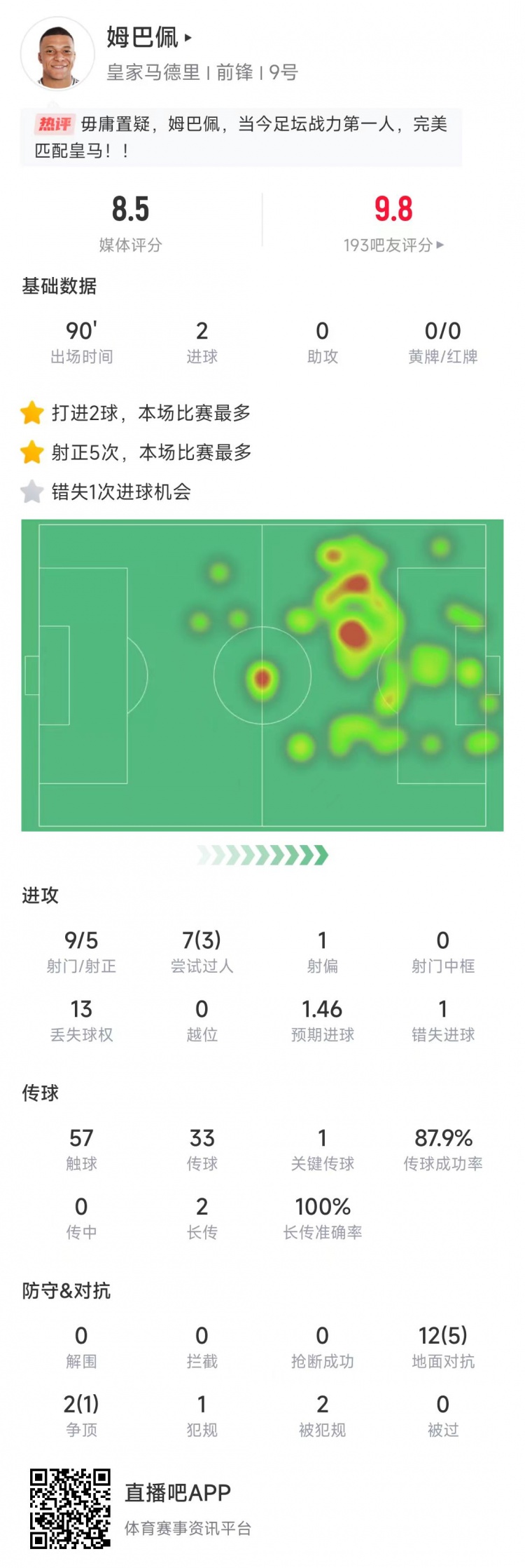 姆巴佩本場(chǎng)比賽數(shù)據(jù):