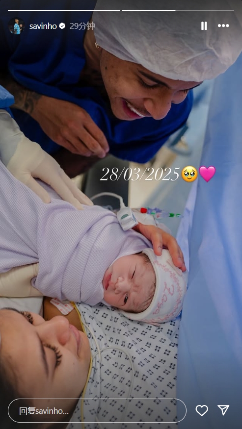 3月30日訊 曼城邊鋒薩維尼奧更新社媒動(dòng)態(tài),慶祝孩子出生。