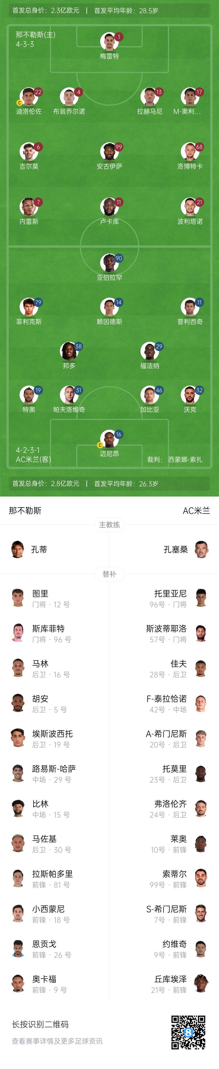 3月31日訊 意甲第30輪,那不勒斯主場對陣AC米蘭。賽前,官方公布了本場的首發(fā)名單。