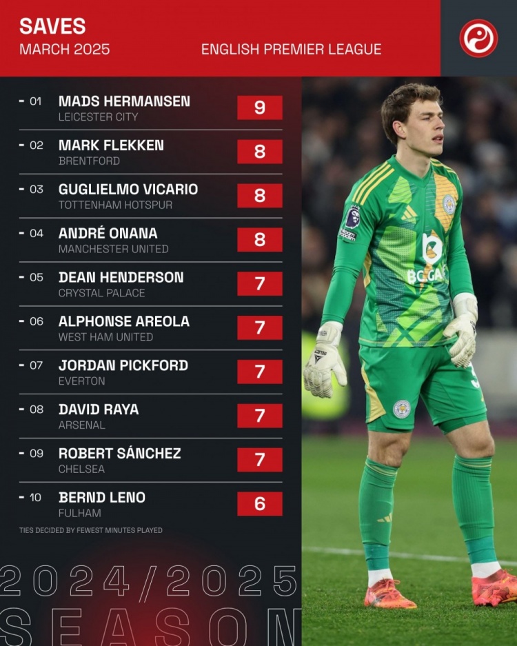 4月1日訊 Squawka統(tǒng)計了3月份英超門將的撲救次數(shù),并列出榜單,赫爾曼森9次居首,弗萊肯、維卡里奧、奧納納8次并列第二。