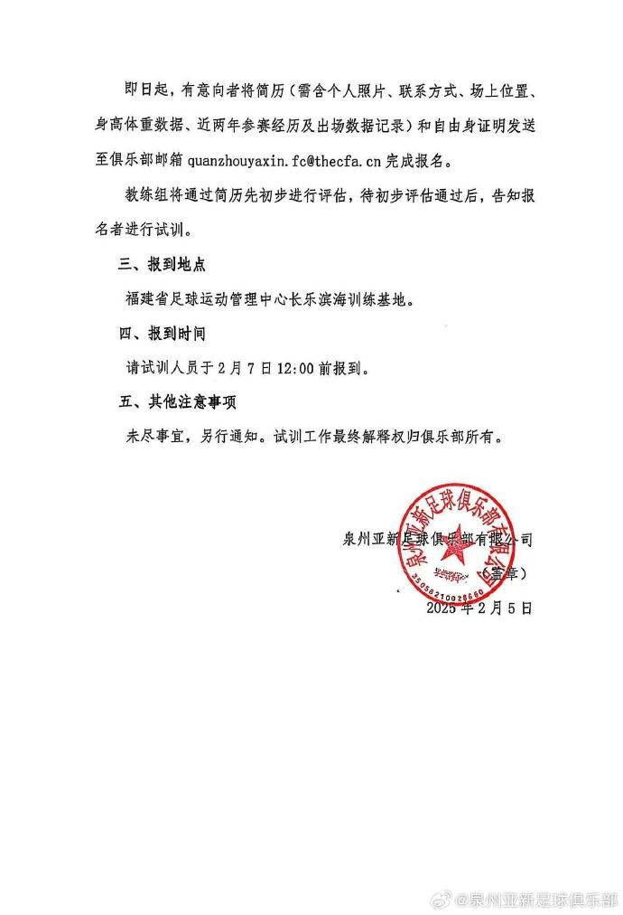 泉州亞新官方表示,為備戰(zhàn)新賽季中乙聯(lián)賽及中國足協(xié)杯,補(bǔ)充提升球隊(duì)實(shí)力,俱樂部決定公開招募優(yōu)秀足球運(yùn)動(dòng)員。