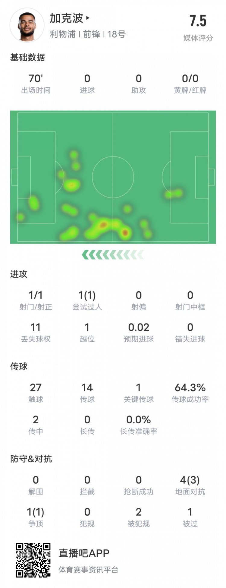 加克波本場比賽數(shù)據(jù):