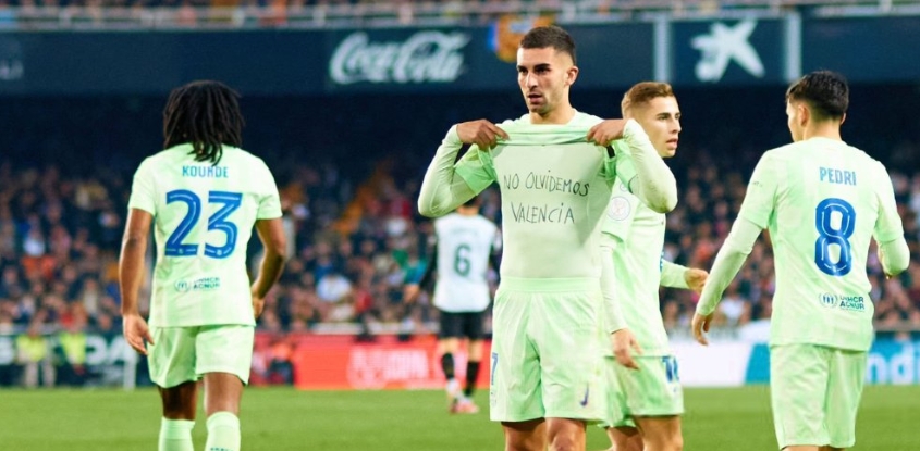巴薩前鋒費(fèi)蘭今日對陣?yán)蠔|家瓦倫西亞戴帽,他進(jìn)球后沒有慶祝,并掀開球衣表示對瓦倫災(zāi)民的紀(jì)念:“別忘記瓦倫洪水受害者”。