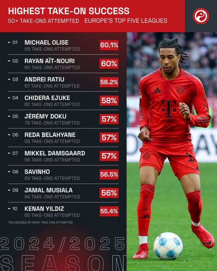 2月8日訊 squawka統(tǒng)計了本賽季五大聯(lián)賽過人成功率情況,奧利塞居首,而五大聯(lián)賽成功過人次數(shù)最多的亞馬爾并未進入前十。