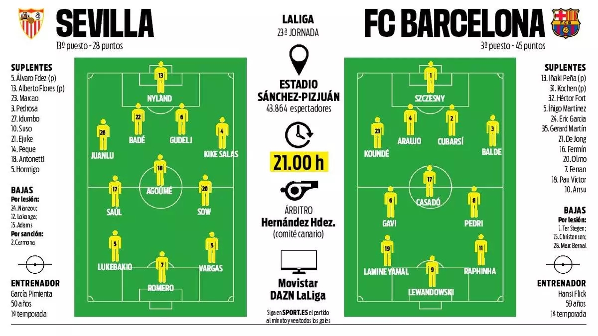 2月9日訊 據(jù)西班牙《每日體育報(bào)》報(bào)道,巴薩將在本輪西甲聯(lián)賽中客場挑戰(zhàn)塞維利亞,萊萬多夫斯基和加維將回到首發(fā)陣容中。